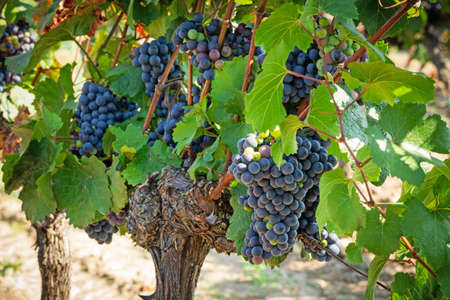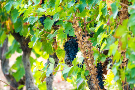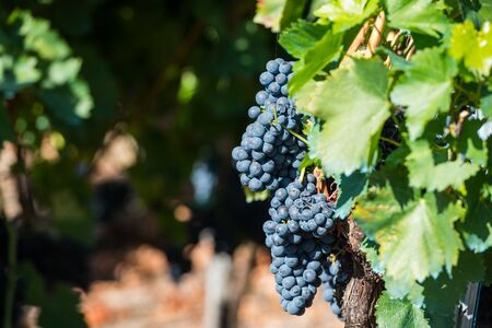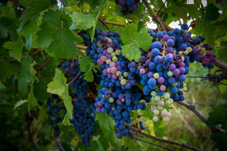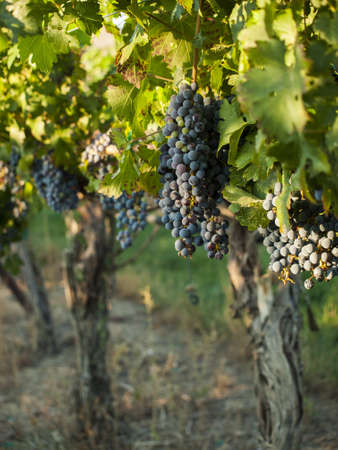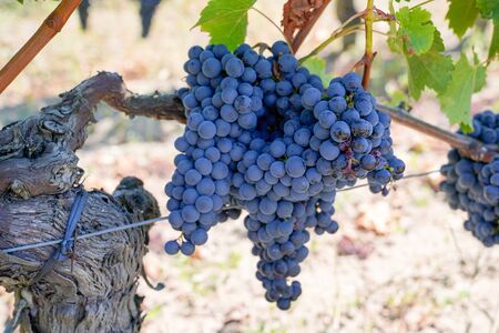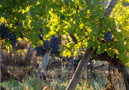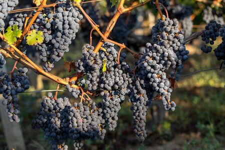 Vineyard with bushes of red ripe grapes ready for harvesting and wine production. Close-ups of red grapes lit by the autumn sun.
