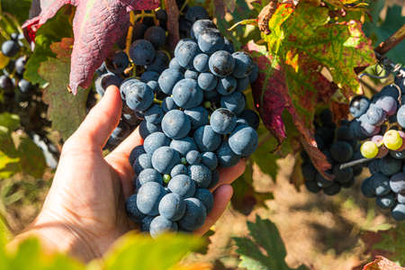Closeup of a hand with blue ripe grapes. Fresh blue bunches of grapes. The concept of winemaking, wine, vegetable garden, cottage, harvest