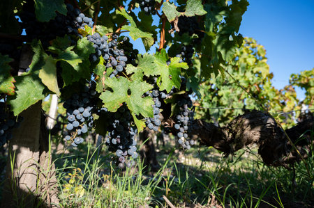 Ripe red Merlot grapes on rows of vines in a vienyard before the wine harvest in Saint Emilion region. France