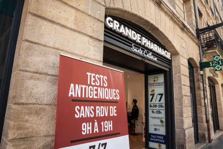 BORDEAUX, FRANCE - FEBRUARY 24, 2022: Sign indicating Tests antigeniques Covid, meaning covid 19 antigenic testing in French on a pharmacy, at coronavirus detection & test facility during Covid pandemic.