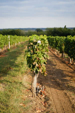 morning vineyard landscape, rows of grapevines, sunrise over vines,