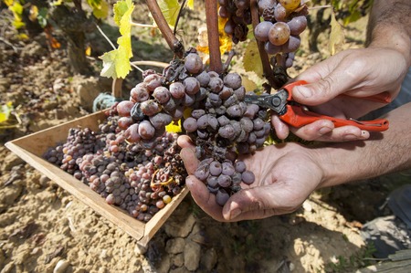Noble rot of a wine grape, grapes with mold, Botrytis, Sauternes, France