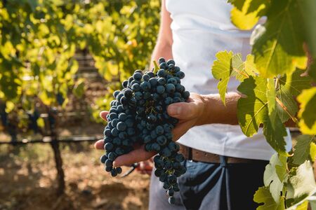 Caucasian winegrower working in an organic vineyard, he holds a bunch of ripe grapes with his hand. Traditional agriculture. Sardinia.