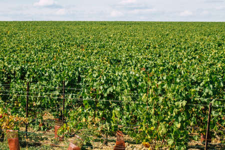 Reims France September 22, 2020 View of Taittinger Champagne house vineyard in early autumn in the countryside of Reims. Taittinger has know how in the service of the creation of exceptional products