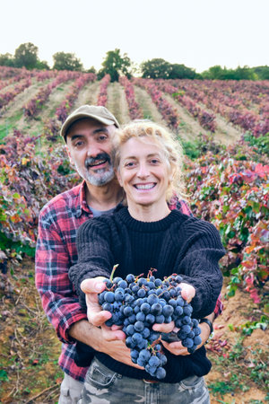 Mature young couple of farmers in a vineyard farmland with a bunch of grapes. Navarre, Spain, Europe.