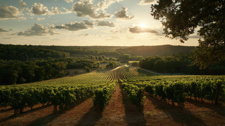 The golden light of sunset bathes lush grapevines in a serene countryside landscape, creating a tranquil atmosphere across rolling hills and distant villages.