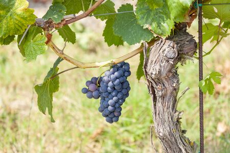 Close up of berries and leaves of grape-vine. Single bunch of ripe red wine grapes hanging on a vine on green leaves background. Plantation of grape-bearing vines, grown for wine making, vinification.