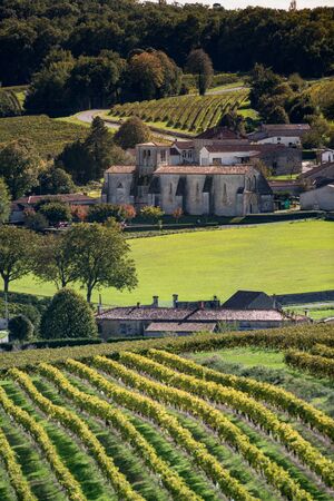 Aerial views of green vineyards, old houses and narrow hilly streets of medieval town St. Emilion, production of red Bordeaux wine on cru class vineyards in Saint-Emilion wine making region, France, Bordeaux
