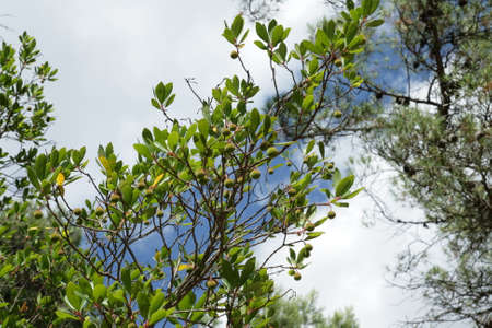 Strawberry tree (Arbutus unedo) in a park in Madrid, Spain. The strawberry tree is one of the symbols of Madrid, it is part of the city coat of arms