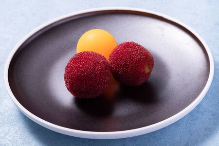 closeup in vertical view of the fruits of the strawberry tree. The fruits of the strawberry tree are used in the preparation of jams, fruit sorbets such as mango and some alcoholic beverages.