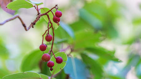 Arbutus or strawberry tree flower, leaves and fruit. Selective focus. Horizontal photography. Copy space.