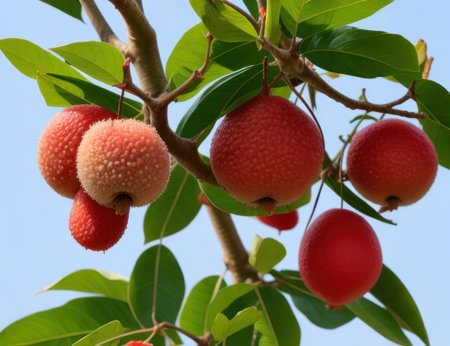 Red fruits on the branches of a tree with green leaves against the blue sky