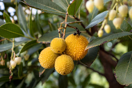 Yellow green ripening strawberry tree fruit on a branch in the garden