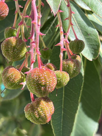 Strawberry Tree, Arbutus unedo with strawberry like dry fruits in hanging bunches, rough on surface