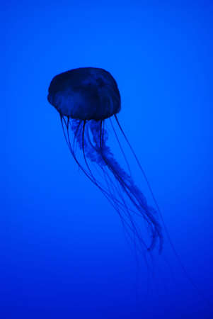 Marble jellyfish, Lychnorhiza lucerna jellyfish drifting gracefully in deep blue water of aquarium. Animal, aquatic organism, underwater life, biodiversity
