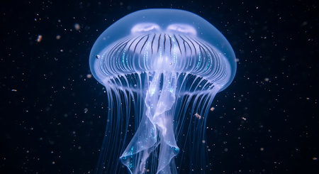 Glowing Jellyfish Floating in Dark Ocean Depths