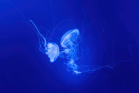 Jellyfishes illuminated with blue light swimming in aquarium.