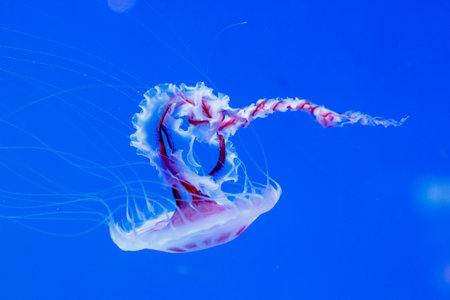 Fluorescent jellyfish swimming underwater aquarium pool with red neon light. The Japanese sea nettle chrysaora pacifica in blue water, ocean. Theriology, biodiversity, undersea life, aquatic organism