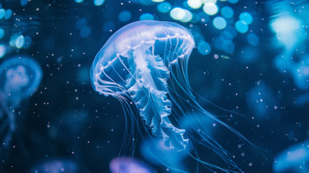 A stunning underwater scene featuring a graceful jellyfish drifting through the deep blue ocean, its translucent tentacles glowing softly in the dim light.
