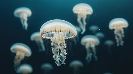 This stunning image showcases beautiful jellyfish gracefully floating in dark waters, highlighting their delicate forms and creating an enchanting underwater scene.