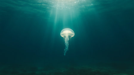 Solitary jellyfish gracefully moves through the ocean, illuminated by beams of sunlight filtering through the water. The serene underwater scene captures the beauty of marine life