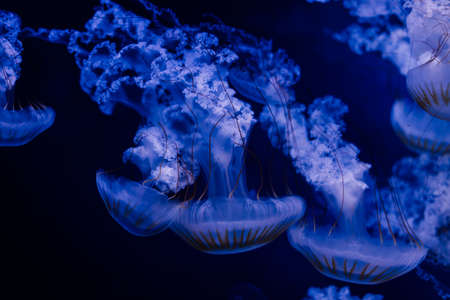 Group of Sanderia Malayensis, Amakusa Jellyfish swimming in aquarium pool with blue neon light. Theriology, biodiversity, undersea life, aquatic organism