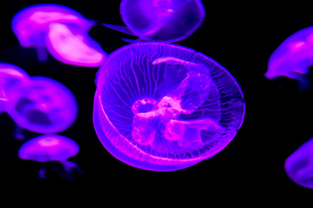 Close-up Jellyfish, Medusa in fish tank with neon light. Jellyfish is free-swimming marine coelenterate with a jellylike bell- or saucer-shaped body that is typically transparent.