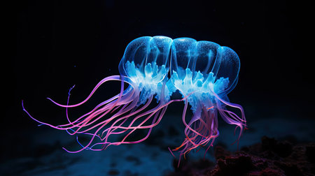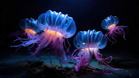 Captivating image of neon glowing jellyfish floating in a dark underwater setting.