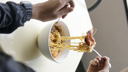 Bowl of instant noodle with minced chicken and boiled egg on wooden table, Hand holding wooden chopsticks and fork over instant noodles.