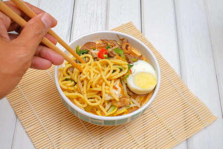 Flat lay or top view shot of a portion of stir-fried Indonesian instant noodles with egg on a white bowl with a pair of wooden chopsticks on white table
