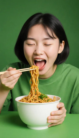Asian girl holding a bowl of noodles with chopsticks and eating it, isolated on white background