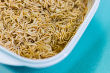 A close-up view of delicious instant noodles in a bowl topped with seaweed. The savory broth and soft texture create a comforting meal experience.