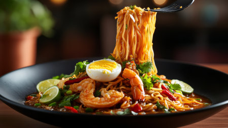 A vibrant bowl of spicy noodles garnished with fresh cilantro and lime slices, perfect for conveying flavors of a delicious homemade meal or a restaurant specialty.