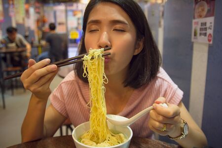 Happy young woman eating noodle soup with dumpling in Chinese restaurant. Japanese girl using chopsticks eating Chinese traditional food. Female blowing hot noodle enjoy delicious food.