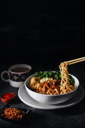 chicken noodles, indonesian ramen with chicken noodle soup, vegetable and dumpling in dark background