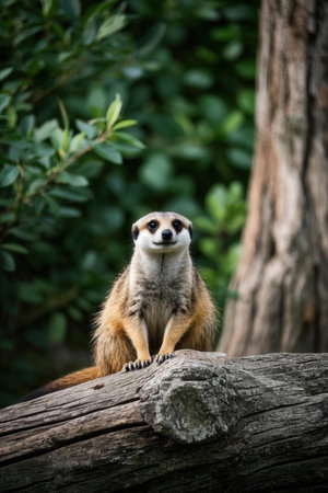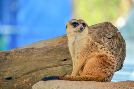 Meerkat sitting on a tree in a zoo. Wildlife animal.