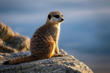 Meerkat sitting on a rock by the sea in the evening