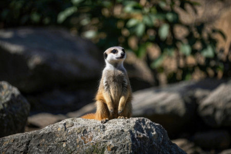 Meerkat standing on a rock in a zoo. Wildlife animal.