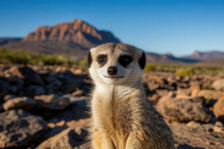 Meerkat sitting on a rock in front of a mountain in Africa
