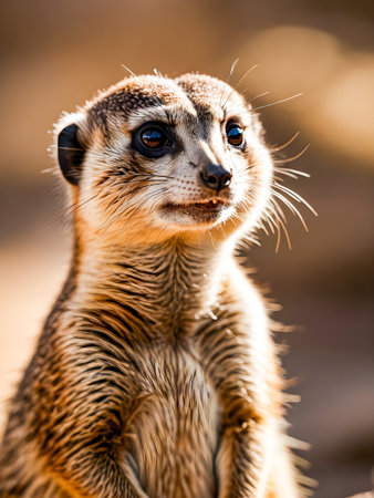 A charming close-up of a meerkat with soft fur, bright eyes, and an inquisitive expression. The warm background enhances the delightful and playful nature of this adorable animal.