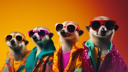 Immerse yourself in a lively, imaginative animal concept showcasing a group of meerkats styled in vibrant, trendy fashion. This striking image captures bold creativity and detailed visual