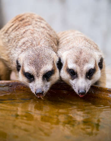 Two meerkats are drinking water, shot in front view