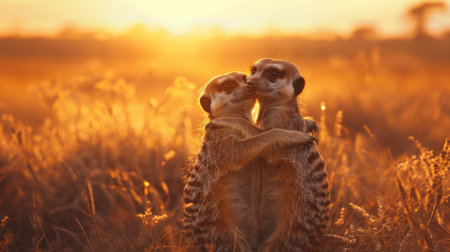 Two meerkats embracing in the golden light of sunset, capturing a moment of affection and warmth in nature