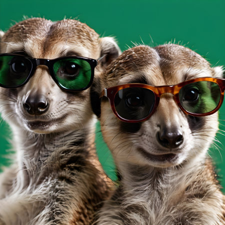 Two meerkats in sunglasses on a green background. Studio shot..generated by AI