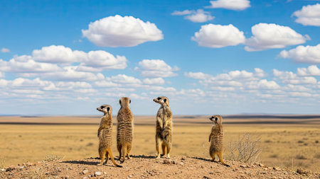 Four alert meerkats stand on guard, scanning the horizon for predators in their natural desert habitat