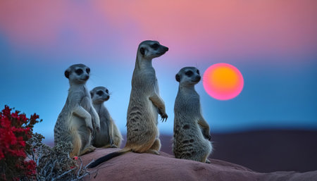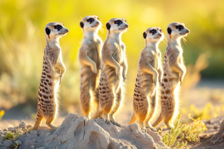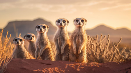 Meerkat Family Alert at Dawn in African Savanna