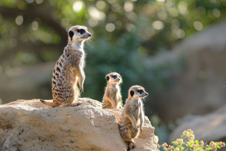 A group of three meerkats relaxing atop a rock, observing their surroundings, A delightful family of meerkats keeping lookout, AI Generated