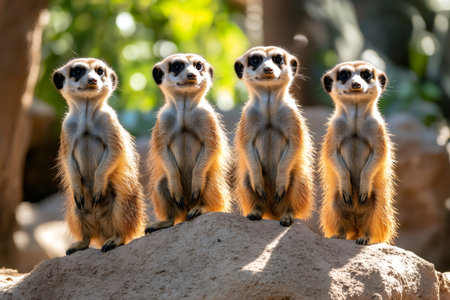 Four meerkats standing alert on a rock, enjoying the sun