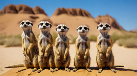 A charming image of five meerkats standing side by side in a desert. The meerkats are alert and looking forward, their brown fur contrasting with the sandy background. The clear blue sky suggests a bright, sunny day in their natural habitat.