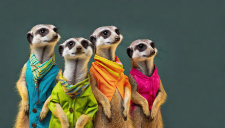 This striking image portrays a group of meerkats dressed in bold, vibrant, and fashionable outfits. Their whimsical charm and playful expressions add a lively and imaginative touch, set against
